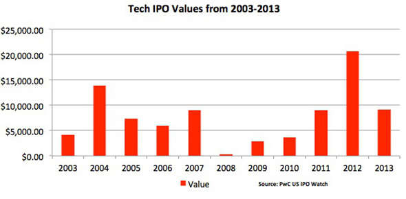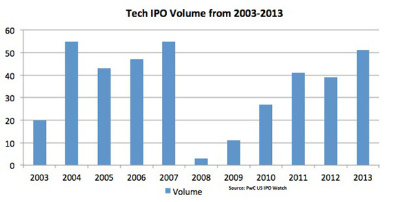 2003 年至 2013 年间科技公司 IPO 的成交量