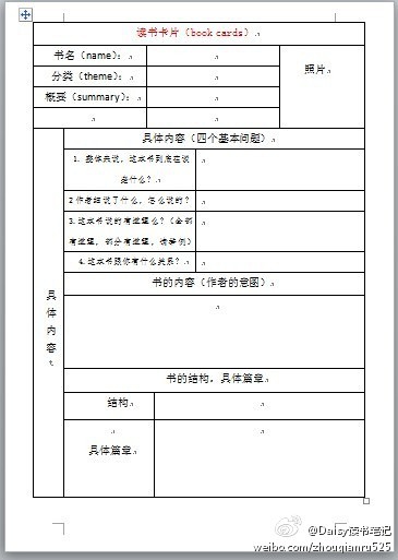这本书的厉害之处在于第二点,分类(assortment)。这本书解决了所有读书人都要面对的问题,为什么要读书,读什么书,什么样的书有怎么样的读法,是深层读书还是浅尝辄止,如何把读书的内容运用到生活中等等问题。不管以后你要不要做读书人,这本书的意义都是巨大的。一下这两个图片分别是一个外国人和我自己根据这部书总结出来的读书卡片。回答其中的问题对你了解你正在读的书或多或少都会有些意义。