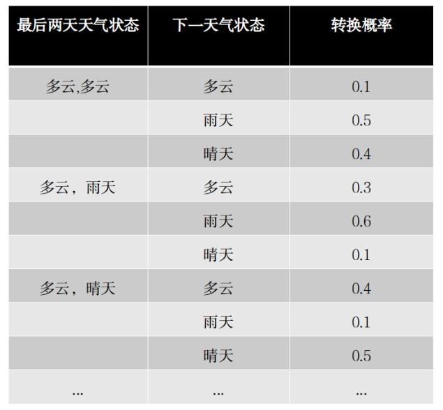 不出意料,雨天的可能性还是最大。无论再计算多少步,结果都会是雨天的可能性最大。这是为什么呢?是因为状态转换表只保存了最后的一个状态的信息,所有的状态转换只与最后一个状态信息相关,所以,接下来的状态也就逃脱不出初始状态的约束了。这种只考虑最后一个状态信息的马尔科夫链称为1 阶马尔科夫链。那如如果要提高准确性,使得下一状态不只是受上一状态的约束,该怎么做呢?可能你已经想到了,提升到多阶马尔科夫链*即可。比如 2 阶马尔科夫链的转换概率表可以用如下的表格来表示(只画出了1/3 部分,其它部分依次类推,共会有 18 种组合):