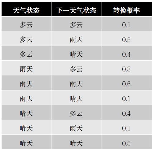 根据日常经验,我们看到当前的天气状态是多云时,天气的下一个状态可能会是下雨;而当雨水开始消退,云也减少时,接下来可能就是天晴了。我们收集某个地区十年内的天气数据,计算出每种天气(暂时限制为三种:多云,晴天,雨天)之间相互转化的概率,统计结果如下表: