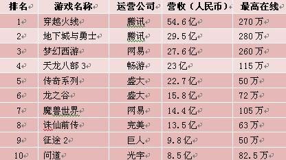 以营收和在线比换算,传奇和穿越火线的比率差不多,其他的则逊色很多。尽管它的同时在线人数不高,收入却并不低。