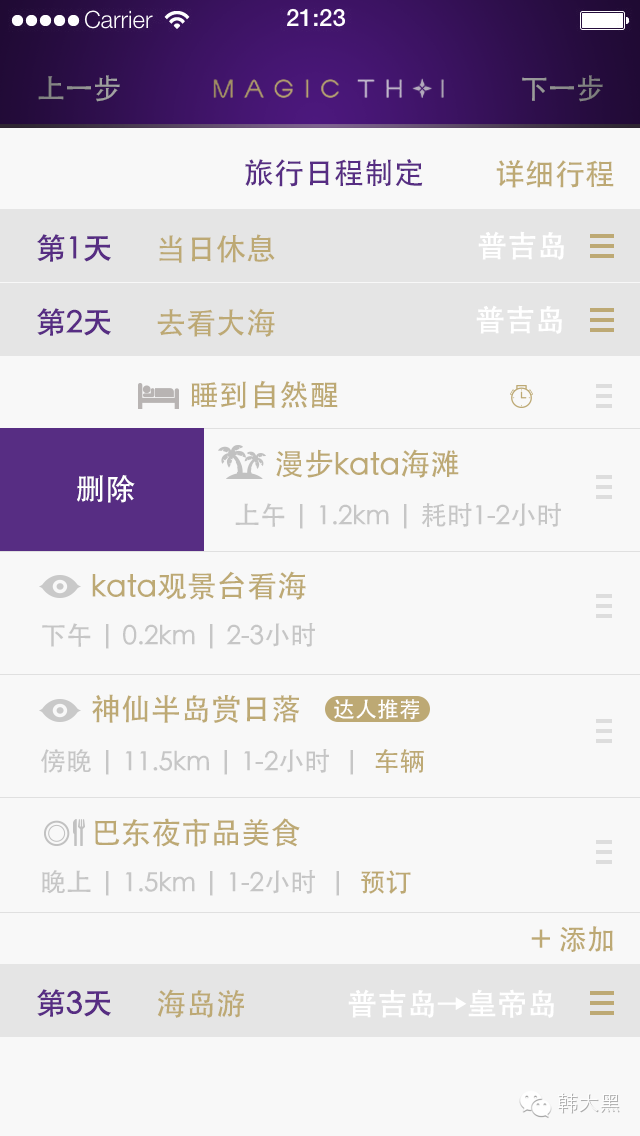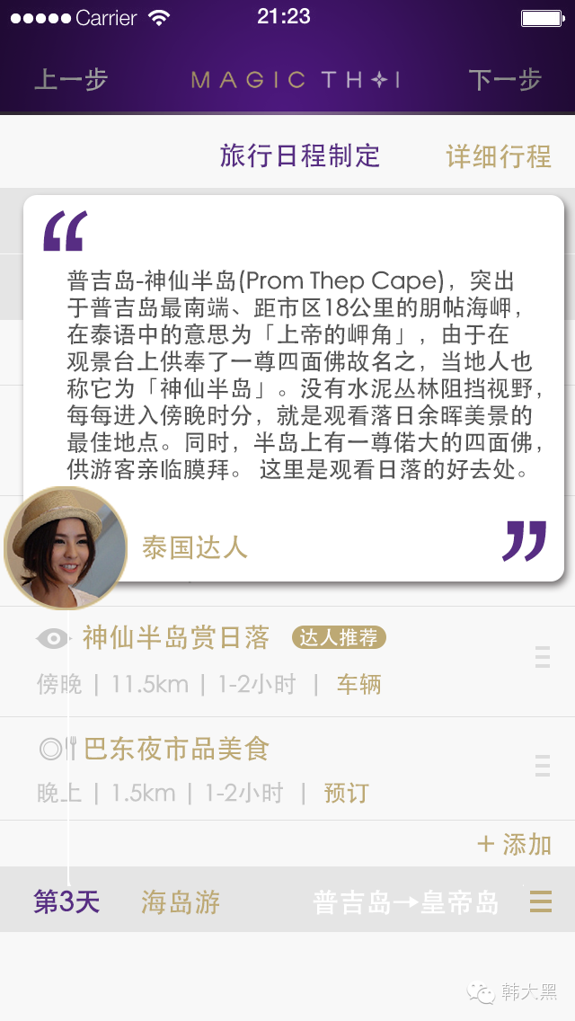 接下来,就根据你的酒店,你的爱好,你要干的事儿以及你的时间帮助你推荐出来了适合你的行程,当然,在这个行程里,你可以修改的你的行为,你也可以看到那个一日游就直接预订,也可以选择好行程后一起预订。遇到你不知道的景点信息,轻松一点就可以获取这个的介绍,接送机,当地用车,随时可以预定。不光可以看自己的全部详细行程,也可以看一个大概。