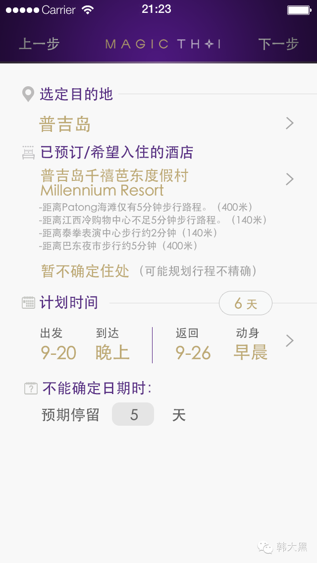 在这一步,我们直接让用户选择前往泰国的城市并告诉我们抵达的酒店和抵达的时间或者航班号码,并且在用户选择好酒店后我们重新帮助用户梳理酒店信息,告诉用户你的酒店有 WIFI,出门左转有餐厅,右转有 711,边上就是海滩这些实用信息。