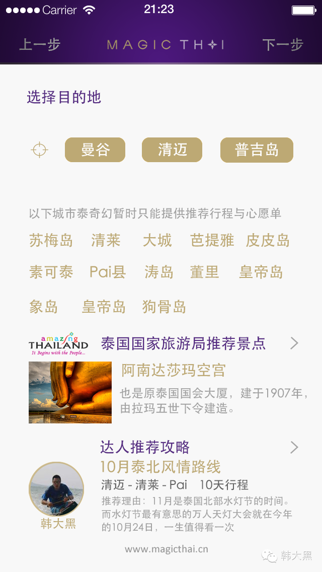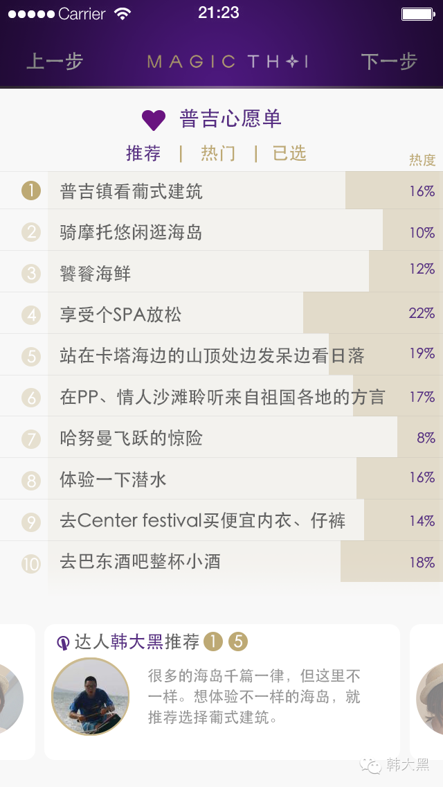 当获取用户的酒店和抵达离开时间后,我们让用户勾选前往一个地方的心愿,这个灵感来源于《泰囧》这个电影,每个城市都有自己的属性,也都有用户的心里预期,根据这个,大概我们就可以知道用户玩儿啥,同时,用户在这步可以看到别人是怎么做的,选的什么,也可以看到达人推荐那个。更看到每个行为的热度。