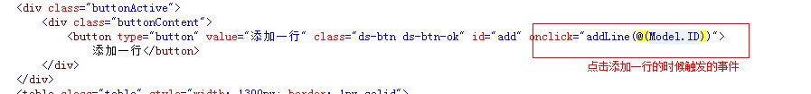<div class="buttonActive"> <div class="buttonContent"> <button type="button" value="添加一行" class="ds-btn ds-btn-ok" id="add" onclick="addLine(@(Model.ID))"> 添加一行</button> </div> </div>View Code