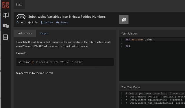 虽然你在 Code Wars 上不会带上法师的帽子,但是你可以通过完成 kata,或者编程挑战来收集点数获得升级。你可以使用 Ruby,JavaScript 或 Coffeescript 来完成 kata。一个 kata 可以由不同的语言完成,这样你就可以很好的理解不同的语言如何完成同样的任务。计划会加入更多的语言,例如 Python,Java,PHP,和 Objective-C,所有这些语言支持已经在开发中。