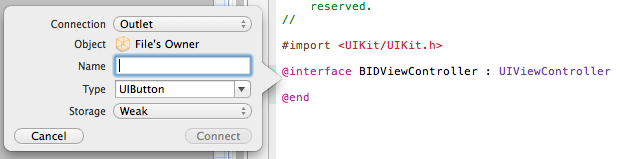 Connection保留默认值Outlet,Name中填写“textStatus”作为Outlet的名称,其他的选项都保留默认值即可,最后点击“Connect”按钮,Outlet创建完成。 创建完成后的代码如下:(BIDViewController.h)