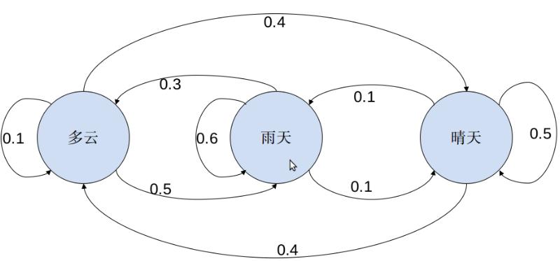 即可得下一状态多云的概率为0、1,雨天的概率为0、5,晴天的概率为0、4,雨天的可能性最大