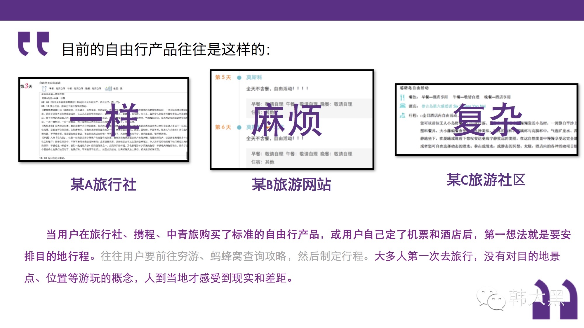 当用户购买完机票、酒店等旅行社自由行产品或者用户自己购买完机票后,下一件事儿就是去蚂蜂窝、穷游等网站查看游记或者攻略,在这一步的时候用户实际上是参考别人的行为,来安排在自己的行程中,但用户往往对当地不了解,很难安排出一个合理的行程。而做攻略做行程这个事儿,对年轻小朋友是一种乐趣,对很多上班的白领阶层来说,能根据自己的情况快速的安排出来目的地行程,且能随时修改自己的行程,不光能修改,还能预订当地一日游项目,不光预订当地一日游项目,还能指导自己前往当地的菜市场,学校,夜市,还能和其他的人一起拼车。而且还能把自己安排出来的行程给老婆审阅,给哥们分享。自己去了当地吃个餐厅还能有优惠,这就赞了。